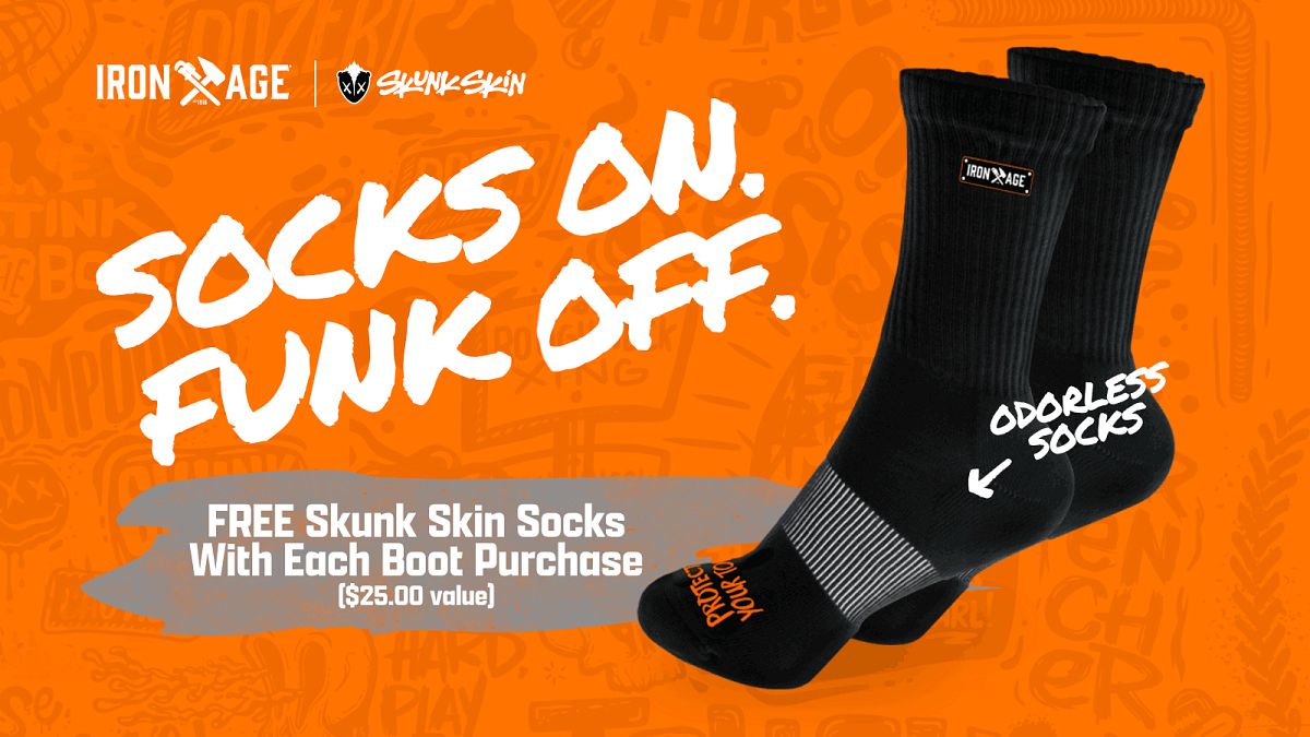 The Iron Age x Skunk Skin socks are available for a limited time, free with purchase, exclusively at http://www.ironagefootwear.com.