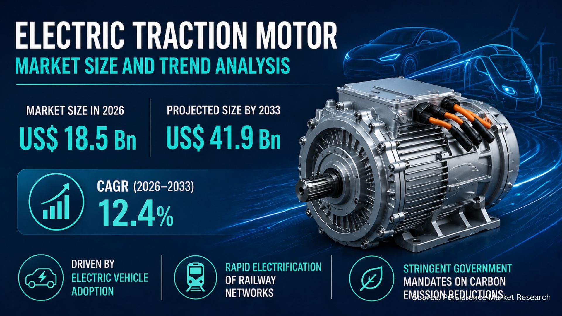 LONDON, LONDON, UNITED KINGDOM, April 30, 2026 /EINPresswire.com/ -- The global electric traction motor market is witnessing robust expansion as industries accelerate their transition toward electrified transportation and energy-efficient systems. According to the latest study by Persistence Market Research, the market is projected to grow from US$18.5 billion in 2026 to US$41.9 billion by 2033, registering a strong CAGR of 12.4% during the forecast period. This growth is fueled by rapid advancements in electric mobility, increased investments in railway electrification, and supportive government policies promoting sustainable infrastructure worldwide.
